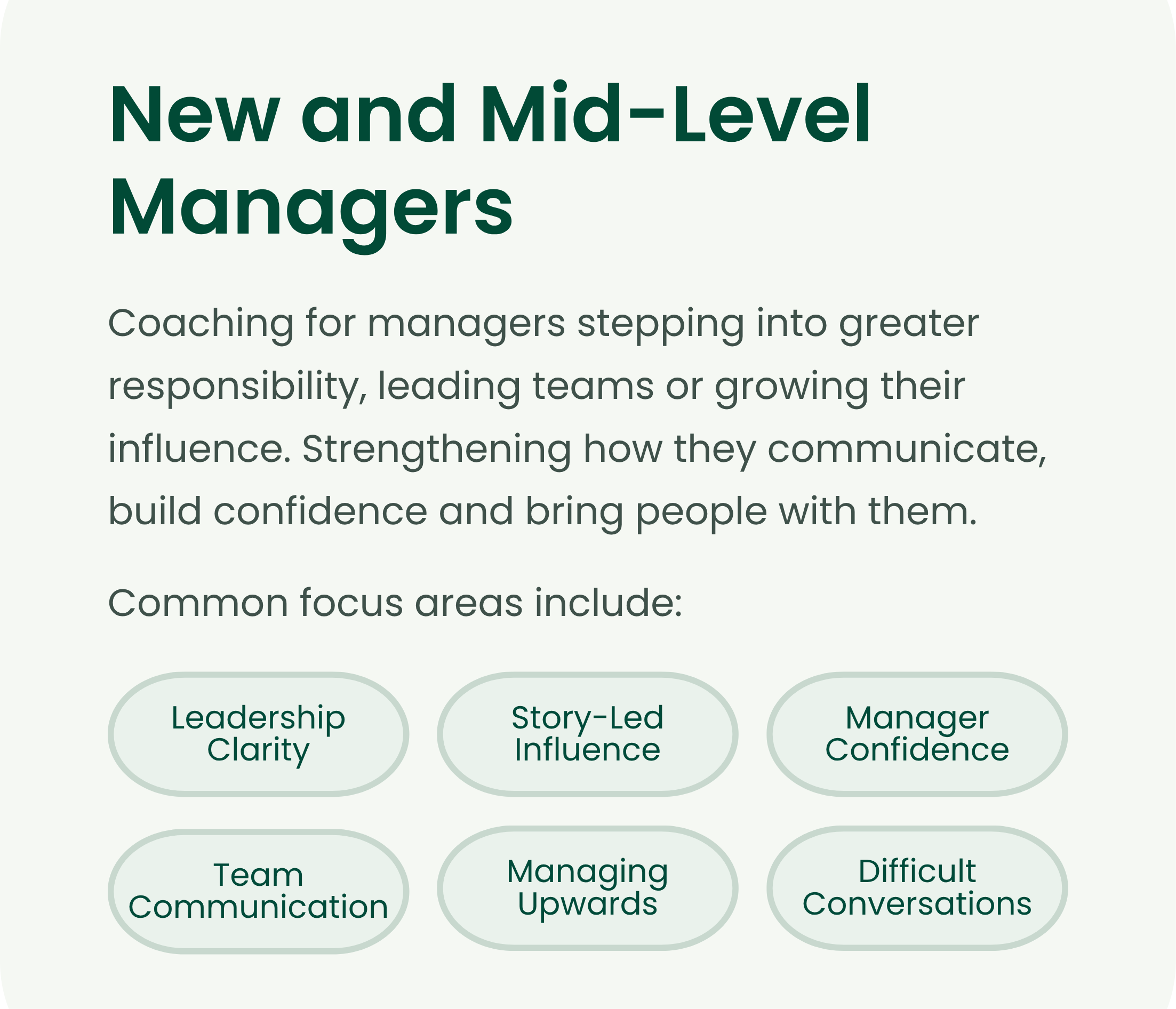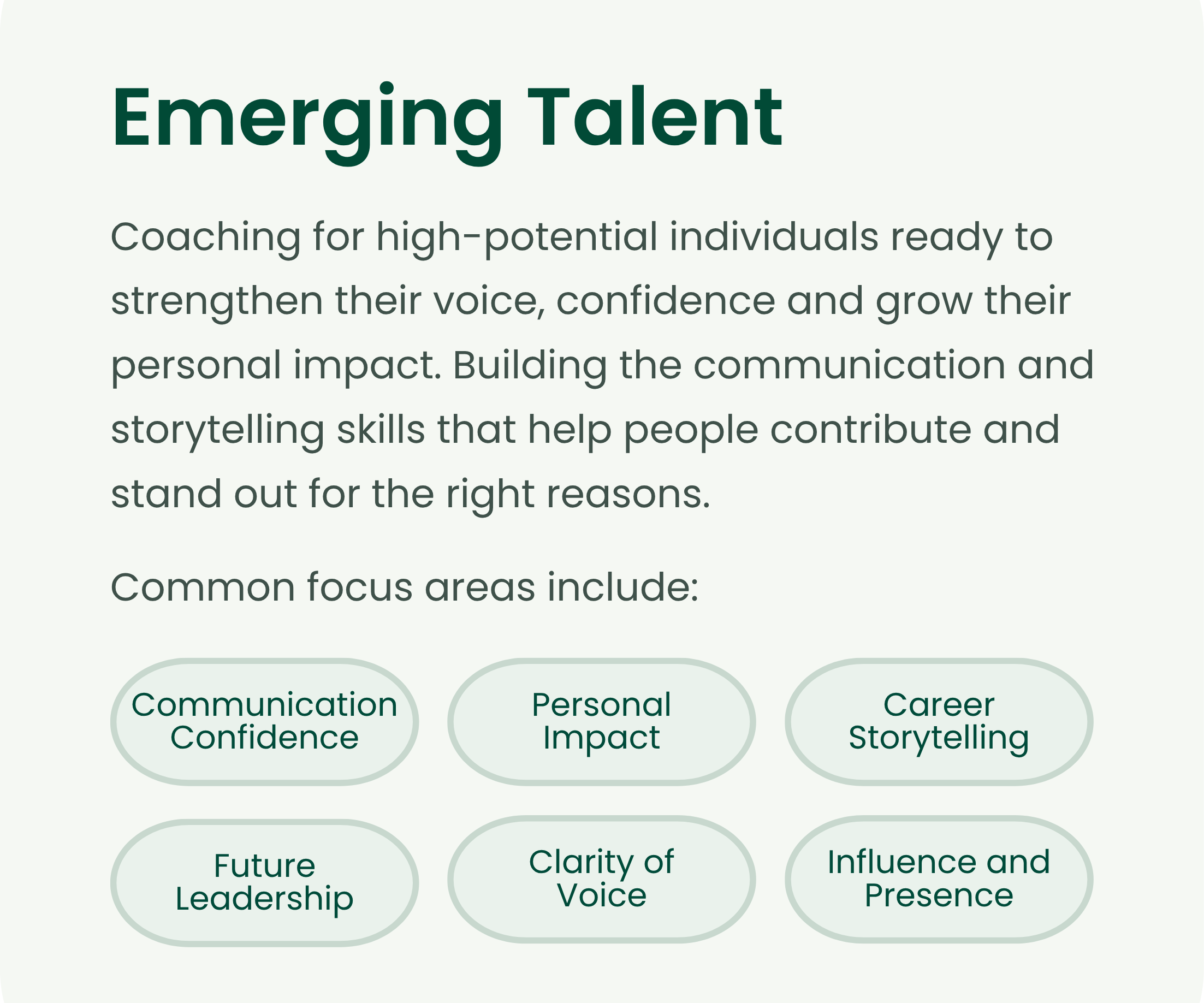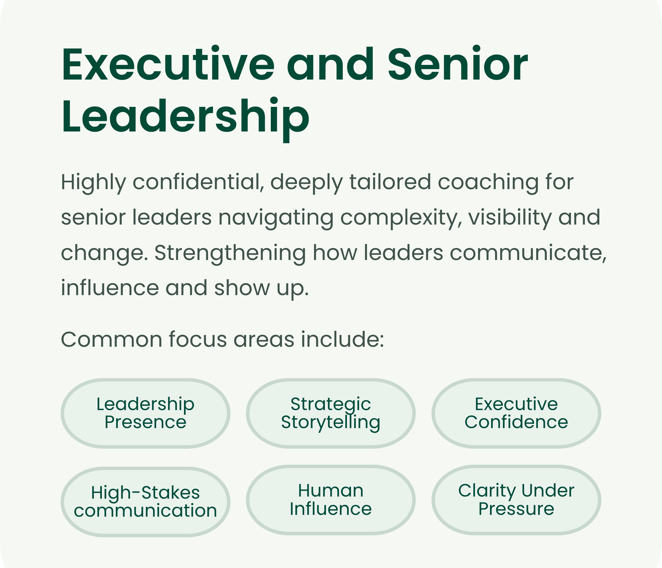 Tailored coaching for people at every level of an organisation, shaped by real-world leadership experience and the practical power of storytelling. Helping leaders, managers and team members communicate with confidence, lead with clarity, and create greater impact in the moments that matter most.